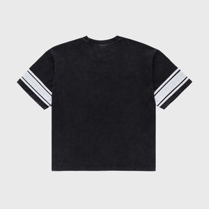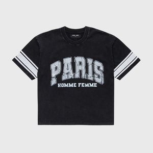 This cropped tee gives jersey vibes with its varsity stripes on the sleeves and bold PARIS print across the chest complimented by Homme Femme below. The tee is stone washed for a vintage look on our classic heavyweight cotton.
