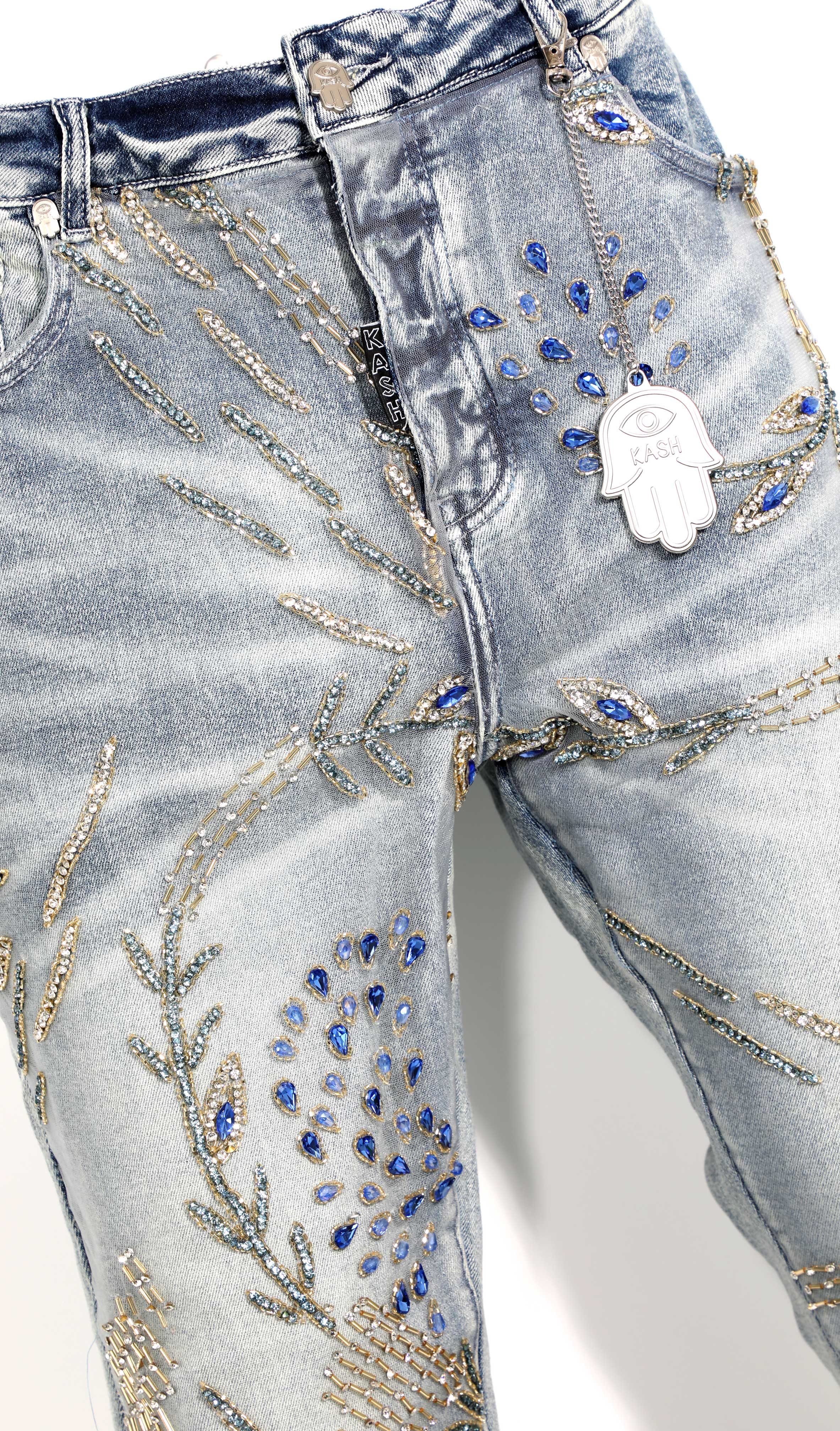 Kash Couture Collection hand sewn stone stacked denim with over 4,000 diamonds - Blue Authorized Seller