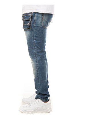 • Stretch Slim jean with patch and zipper pocket and light distress