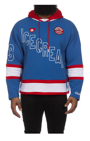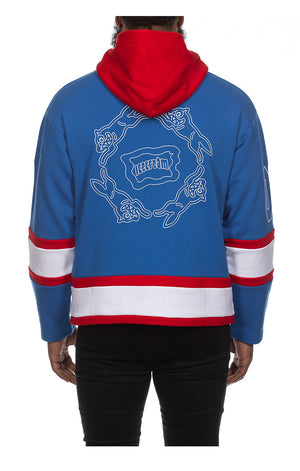 • LS PULLOVER HOODIE FAUX HOCKEY JERSEY CONTRAST STRIPES AND RUBBER PRINT