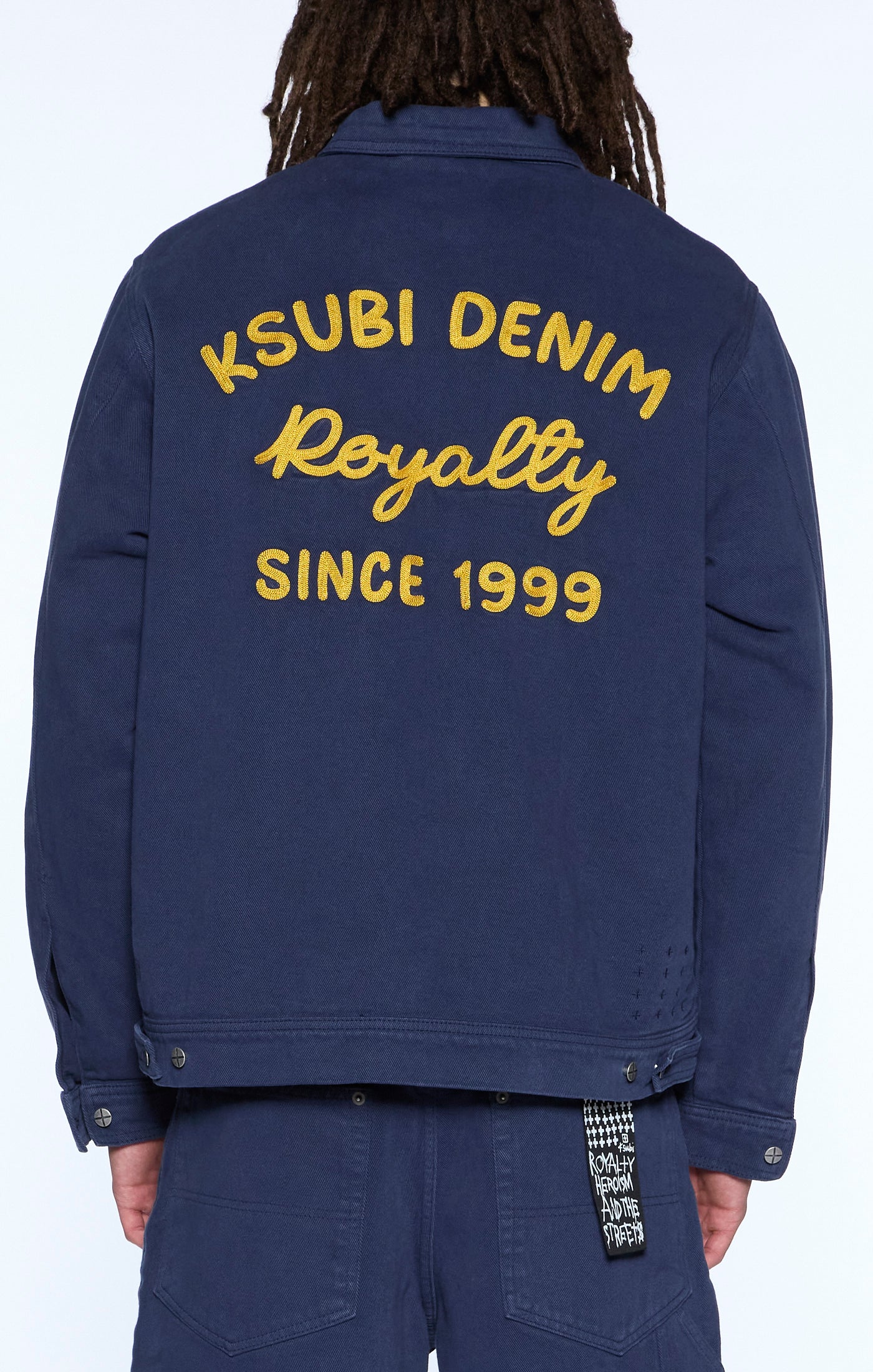 Oversized fit workwear jacket made from 12OZ cotton twill. Details include kissing CF zip closure and CF chest pocket. Waistband with tab adjusters and shanks. Includes a Ksubi Denim Royality chainstitch across back and at chest. Finished with t-box and 4x4 embroidered branding, and Ksubi branded hardware.