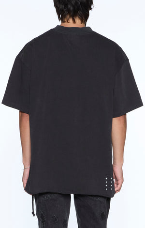 Boxy oversized fitting short sleeve t-shirt with a dropped shoulder and raw cut back hem. Detailed with a reversed overlocked side seam, signature rats tail and branded logos. Made from a premium 280gsm cotton jersey in acid black. Featuring seasonal artwork printed on the front and back. Finished with t-box and 4x4 embroidery branding.
