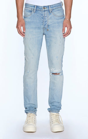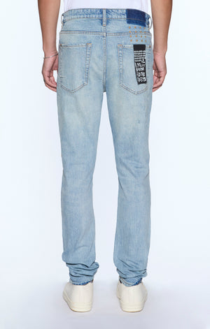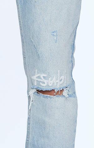 A mid rise five pocket full length skinny jean. Made from a premium comfort stretch indigo denim with a heavy stone wash. Constructed with unique angled belt loops and front fly seam detail. Featuring seasonal embroidery on the front and back of the garment. Finished with t-box and 4x4 embroidery, ghost patching detailing and Ksubi branded hardware.