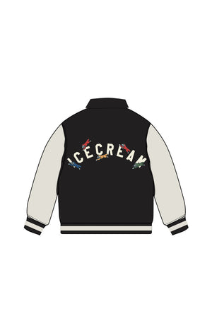 • VARSITY JACKET W SNAP FRONT LARGE STRIPE RIB LEFT CHEST PRINT EMBROIDERIES AT BACK
