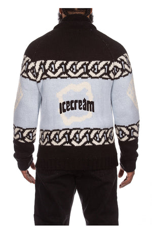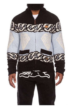 • COWICHAN CARDIGAN ROLL COLLAR W JACQUARD PATTERN AND EMB LOGO LEATHER TRIMS